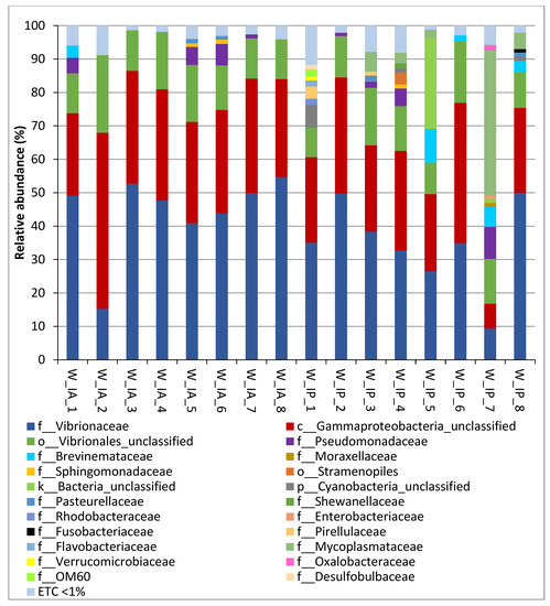 Relative abundance (percentage) at family level for each sample of intestinal microbiota from anterior and posterior sections of wild C. labrosus. In the figure, W_IA corresponds to the anterior intestinal section of wild fish, and W_IP corresponds to the posterior intestinal section of wild fish. ETC: families < 1%.