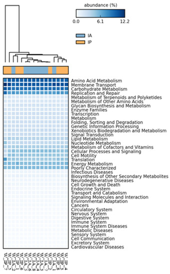 Relative abundance (%) of the functional predictions on the microbial composition of anterior (IA) and posterior (IP) intestinal sections of wild C. labrosus at KEGG level 3. In the table, functions with a relative abundance ≤0.020% have been removed.