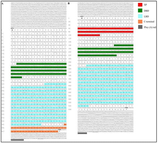 The cDNA sequence and amino acid of ERs of P. sinensis. The start codon and end codon are in bold black, * denotes the termination codon, and the underline denotes the 3′ untranslated region with the tailing signal AATAAA. SP: signal peptide. DBD: DNA-binding domain. LBD: ligand-binding domain. (A) The cDNA sequence and amino acid of ERα. (B) The cDNA sequence and amino acid of ERβ.