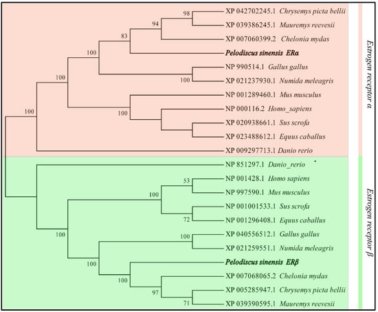- Wang, L.; Cen, S.; Shi, X.; Zhang, H.; Wu, L.; Tian, X.; Ma, W.; Li, X.; Ma, X. Molecular characterization and functional analysis of Esr1 and Esr2 in gonads of Chinese soft-shelled turtle (Pelodiscus sinensis). J. Steroid Biochem. Mol. Biol. 2022, 222, 106147. [Google Scholar] [CrossRef] [PubMed]