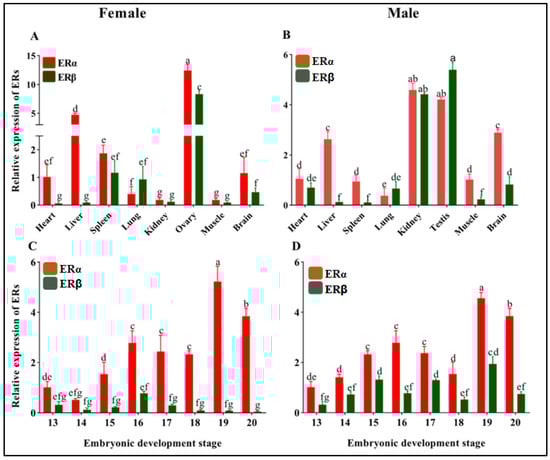 Expression profiles of ERs cloned from P. sinensis in normal adult females (A) and male tissues (B), and expression analysis in blank group female embryos (C) and male embryos (D) at different embryonic development stages. Data are mean ± SD (n = 3). Significant differences at p < 0.05 are labeled with different letters.