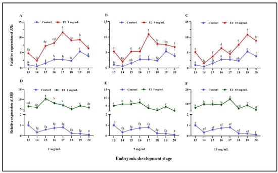 Expression of ERs in E2-treated male embryos at embryonic development stages after injection with different concentrations of E2. Data are the mean ± SD (n = 3). Different letters indicate significant differences between the control group and the experimental group, respectively (p < 0.05): (A) ERα for 1 mg/mL E2; (B) ERα for 5 mg/mL E2; (C) ERα for 10 mg/mL E2; (D) ERβ for 1 mg/mL E2; (E) ERβ for 5 mg/mL E2; and (F) ERβ for 10 mg/mL E2.