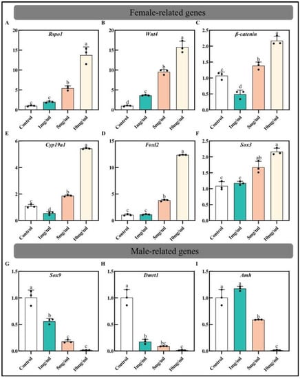 The expressions of sex-related genes at stage 17. Female-related genes: (A) Rspo1; (B) Wnt4; (C) β-catenin; (D) Foxl2; (E) Cyp19a1; and (F) Sox3. Male-related genes: (G) Sox9. (H) Dmrt1 (I) Amh. Data are the mean ± SD (n = 3). Significant differences at p < 0.05 are labeled with different letters.