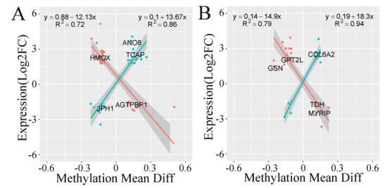 3.5. Correlation Analysis of Transcriptome and Methylation Results