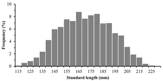 A total of 3509 fish were analyzed from 2005 to 2014 along the distribution area of temperate S. sagax stock. The SL frequency distribution (Figure 2) for all seasons combined (2005–2014) showed a length range from 114 to 226 mm of SL, with an average of 169.1 mm SL and SD at 21.07 mm; in weight, the sardines ranged between 20 and 192 g of TM (mean: 82.94 ± 32.77 g). The length frequency distributions and ages for each year are presented in the Figure S1 and Figure S2, respectively (Supplementary Materials). It was observed that there were differences between years, with some years presenting very few small fish (or young ages) and others with fewer large fish (or older).