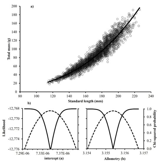 where parameter b indicates the growth pattern, and a is a parameter describing body shape []. Adjustments were performed using the maximum log-likelihood function.