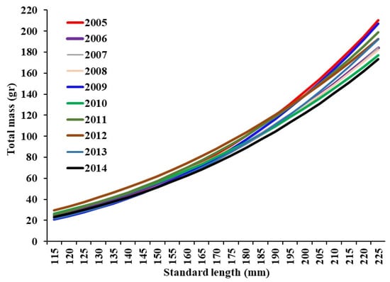 Body mass allometry was established from the relationship between total body mass (TM; g) and standard length (SL; mm), considering all sampled data (2005–2014), using the potential model [].