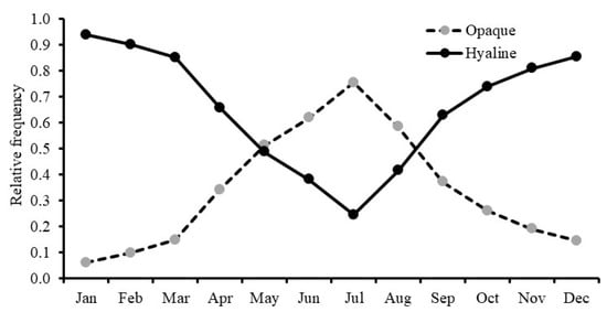 Monthly relative frequencies of otoliths with opaque edge (white circle) and hyaline (black circle) for the temperate Sardinops sagax stock in the southern California Current System (CCS) from 2005 to 2014.