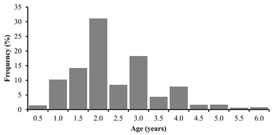 A sensitivity analysis was performed to quantify the effect of the sampled distribution on the growth parameter estimates following the approach of Bolser et al. [] and Scherrer et al. []. For this, different amounts of simulated data were added to the original data, such that each observed age (0.5 to 6.0 years) had 500 observations to compensate for unequal sampling between age groups. In the case of ages 2.0 and 3.0 years, data were not simulated because these ages had 1090 and 640 data, respectively; therefore, in these two cases, 500 data were randomly selected from the raw data. The data were simulated from a normal distribution with the same mean and standard deviation as the raw data in each age class. The normality of the data distributions was tested using the Kolmogorov–Smirnov statistical test. Each model was then fitted using this new dataset, and the goodness of fit was assessed in the same way as described above. Bolser et al. [] and Scherrer et al. [] highlighted that this type of approach does not explicitly consider differences in selectivity or differences between the structure of the sampled and the true population but can fill critical gaps caused by these and other factors [,] by homogenizing the number of observations of each of the age–size classes.