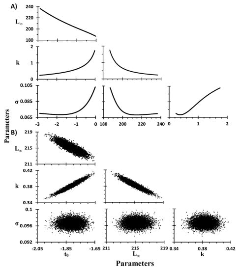 Monte Carlo simulation for parameters estimated by the von Bertalanffy Model of the temperate Sardinops sagax stock considering (A) two parameters (t0 fixed) and (B) three parameters.