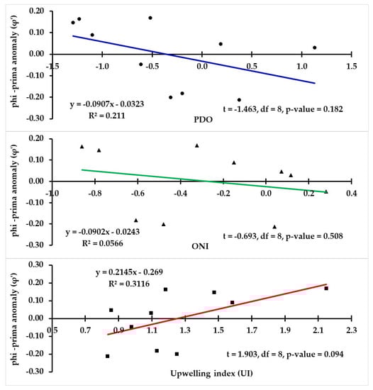 The interannual relationships of the individual growth of the temperate stock of S. sagax (φ′) with environmental variables such as the Pacific Decadal Oscillation (PDO, httph://www.ncei.noaa.gov/pub/data/cmb/ersst/v5/index/ersst.v5.pdo, accessed on 6 February 2021), the Oceanic El Niño Index (ONI, https://psl.noaa.gov/data/correlation/oni, accessed on 11 February 2021), and the Upwelling Index (UI, https://www.pfeg.noaa.gov/products/PFELData/upwell/monthly/upindex.mon, accessed on 14 February 2021), were analyzed through a simple linear regression analysis and using Pearson’s correlation test.