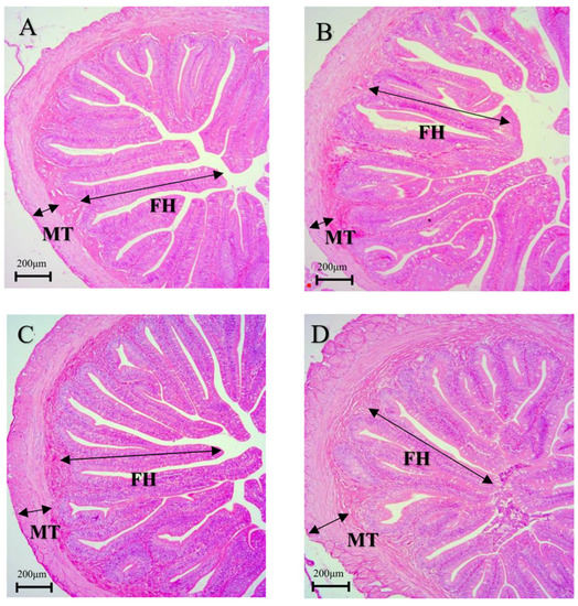 Effects of dietary Macleaya cordata extract (MCE) supplementation on the intestinal morphology of juvenile American eel. (A) Control group, (B) MCE25 group, (C) MCE50 group, and (D) MCE100 group (Magnification × 100). FH = fold height; MT = muscular thickness.