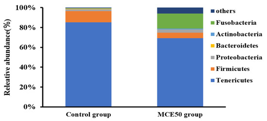 As shown in Figure 2, the predominant bacteria at the phylum level in the intestine of the MCE50 group and the control group were Tenericutes, Fusobacteria, and Firmicutes. Compared with the control group, there was an increasing trend of relative abundance of Fusobacteria and a decreasing trend of the relative abundances of Tenericutes and Firmicutes in the MCE50 group.