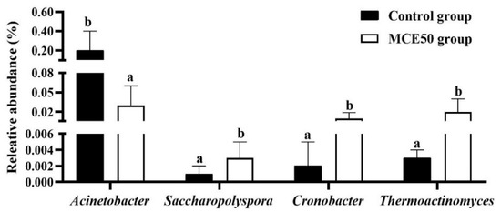 The differential bacteria at genus level in the intestine of the control group and MCE50 group were presented in Figure 3. Compared with the control group, the lower relative abundance of Acinetobacter and the higher relative abundances of Saccharopolyspora, Thermoactinomyces, and Cronobacter were in the MCE50 group (p < 0.05).