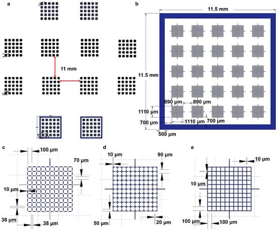 Renderings of the 2-dimensional design of SSCC device. Overall design used to create the photomask for fabrication of the SSCC chips (a). Each device contained 25 arrays in a 5 × 5 pattern (a,b), with the enclosed design incorporating a border surrounding the grids (b). Each grid contained 100 squares arranged in a 10 × 10 pattern (c–e) with each square measuring 100 μm (L) × 100 μm (W) × 10 μm (H). Three different grid designs were produced: open-corners (c), open-midpoint (d), and closed-grids (e). Only the closed-grid design incorporated enclosed walls surrounding the array (b).