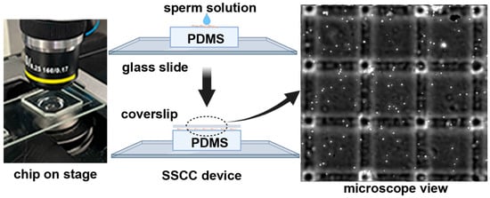 Operation of the SSCC device. The PDMS chip was placed on a microscope stage (left), sperm suspension was pipetted onto the surface, and a coverslip was applied to form a monolayer (middle). The 3 × 3 arrangement of chambers is shown at 100-× magnification (right). Created with BioRender.com.