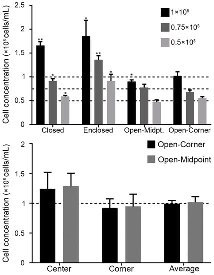 The chambers with enclosed walls produced significantly higher concentrations for all three dilutions (P = 0.0255 for 1 × 108, P = 0.0022 for 0.75 × 108, and P = 0.0413 for 0.5 × 108 cells/mL). Chambers with the closed-grid design produced significantly higher concentrations for all three dilutions (P = 0.0012 for 1 × 108, P = 0.0232 for 0.75 × 108, and P = 0.0174 for 0.5 × 108 cells/mL) (Figure 3). The open-corner was the only design to not produce a significant difference between the measured and the target concentrations. While the open-midpoint design was superior to the enclosed chamber and closed grid designs, when used for the 1 × 108 cells/mL solutions the counts were significantly lower (P = 0.0301). Based on these results, designs with open-corner and open-midpoint grid lines were chosen for subsequent experiments.