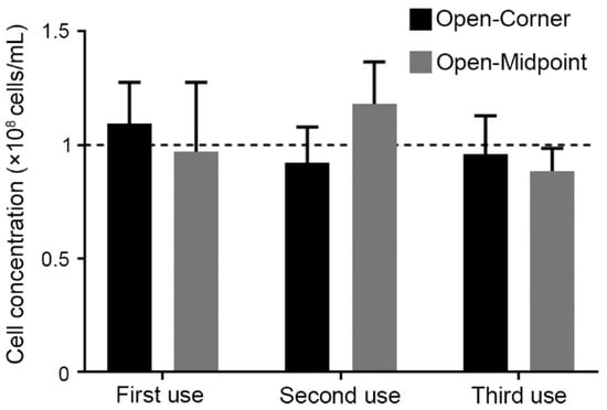 Repeatability of SSCC devices with open-corner and open-midpoint grid configurations for counting of zebrafish sperm (1 × 108 cells/mL) (n = 5; mean ± SEM) with two-way ANOVA multiple comparisons (Dunnet), compared to first use. The dashed line indicates solution concentrations.