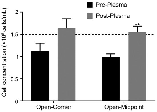 Comparison of the SSCC device with and without plasma bonding to a glass microscope slide for counting of zebrafish sperm (1.5 × 108 cells/mL) (n = 5; mean ± SEM) with a t-test ** indicates P = 0.006. The dashed line indicates the solution concentration.
