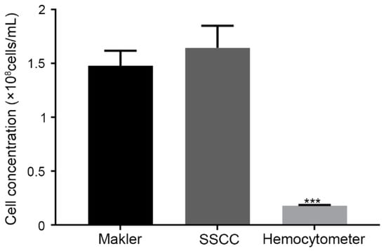 Performance comparison of a Makler® counting chamber, SSCC device, and hemocytometer with zebrafish sperm (n = 5, Mean ± SEM) with two-way ANOVA multiple comparisons (Dunnet). *** indicates P < 0.001 when compared to the Makler® and SSCC.