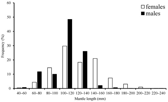 The range for ML was 63–229 mm with a mean of 124.97 mm, accounting for about 80.7% of females that were in the 80–160 mm length class. Male ML ranged from 59–184 mm with a mean of 114.21 mm, accounting for 90.1% that were in the 80–140 mm length class (Figure 2).