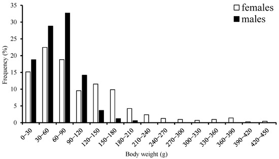 The range for BW was 13–435 g with a mean of 104.05 g, accounting for about 77.5% of females that were in the 0–150 g body-weight class. Male BW ranged from 8–152 g with a mean of 92.33 g, accounting for 91.3% that were in the 0–120 g body-weight class (Figure 3). According to the range of ML suggested by a previous study [1], most samples belonged to the dwarf form.