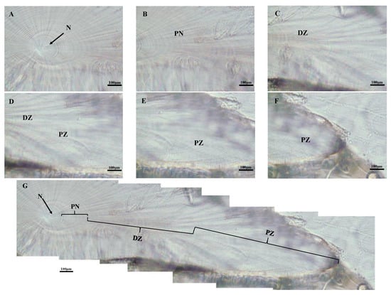 Statolith microstructure of S. oualaniensis from the waters of the Xisha Islands of the South China Sea (female with mantle length 138 mm, body weight 173 g, age 169 d). (A) The nuclear zone (N); (B) the post-nuclear zone (PN); (C,D) the dark zone (DZ); (E,F) the peripheral zone (PZ); (G) growth increments in microstructure.