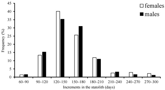 The age ranged from 81 to 298 days and from 67 to 286 days, both with a high concentration in the 90–210 d group, accounting for 92.0% of females and 81.6% of males, respectively. The life span of females was obviously longer than that of males. The results of this study were not similar to those of research performed off the Southwestern coast of India [50], the western Philippines of the South China Sea [51], and the Northwest Indian Ocean [4], where the life span was more than 10 months. The longevity of the samples in this study was larger than that of the squid from the Bashi Channel [45], the Eastern Tropical Pacific Ocean [12], the Northern Pacific Ocean [13], and the Bay of Bengal [15], where the estimated longevity of this type of squid was no greater than 6 months. The longevity of S. oualaniensis shows a geographic variation, and there are many factors responsible for this phenomenon, such as the temperature, the food availability, and so on [52]. Generally speaking, squid living in cold waters with lower temperatures and higher food availability have a longer life span than those which live in tropical waters [52]. This study found that females have longer life spans than males just as a common feature of squid growth.