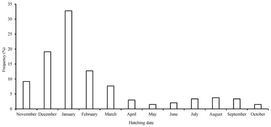 Frequency distribution of back-calculated hatching dates for S. oualaniensis in the waters of the Xisha Islands of the South China Sea.