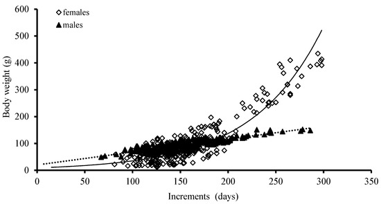 The best growth models for BW were an exponential function and a power function for females and males, based on the AIC model, respectively (Table 2; Figure 8).