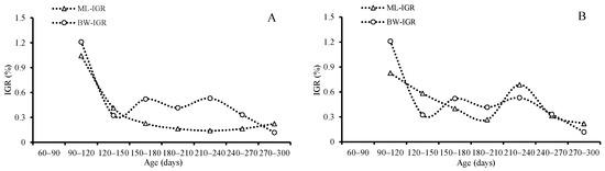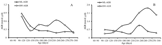 Both the averages of the AGRs and IGRs for ML and BW decreased with age until they reached the highest value (1.07 mm/d for ML, 2.11 g/d, and 2.53 for BW) at the age between 210 and 270 days, and then they decreased again for females; however, the average of the IGRs and AGRs for ML and BW reached the highest value (0.88 mm/d and 1.04 for ML and 0.770 g/d and 1.211 for BW) in the beginning at the age of 90–120 days, and then then decreased for males (Table 3, Figure 9 and Figure 10).