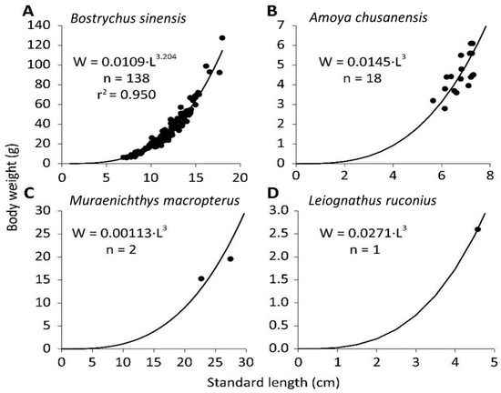 Example of different types of length–weight relationships (LRW) derived for mangrove fishes from Dongzhaigang Bay, China from July 2020 to April 2021. (A): a common LWR, covering a wide range of size with numerous L–W data pairs, and whose parameters (a, b) were estimated by a linear regression of log(W) vs. log(L); see also Table 1. (B): an LWR with b set at an assumed value of 3 because the L–W data pairs cover only a narrow range of sizes. (C): the same, with only 2 L–W data pairs. (D): the same with only 1 L–W data pair. See Table 2 for more cases similar to (B–D), and the text for comments on the assumption that b = 3.