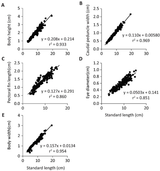 Finally, linear regressions were run for all species for which there were sufficient numbers of measurements, covering a sufficient range of lengths: between their standard length, and their body height and width; the height of the caudal peduncle; and the pectoral fin length and eye diameter.