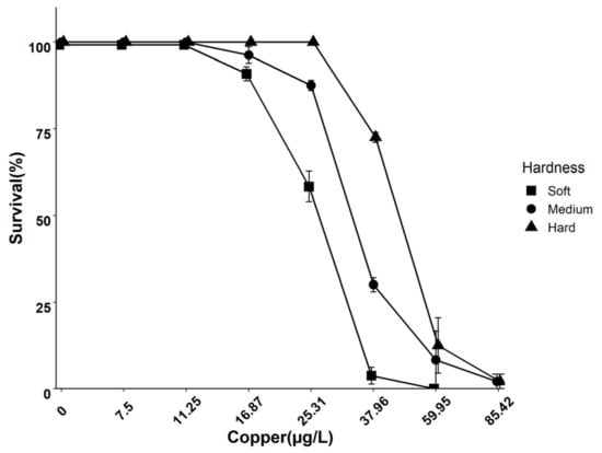 The 96 h acute toxicity decreased by increasing water hardness. Daphnids exposed to Cu in soft water showed a lower LC50 value compared to daphnids exposed to Cu in medium and hard water (Figure 1). A chemical equilibrium model was applied to determine whether the protective effects of hardness on the survival of daphnids were related to changes in the speciation of Cu. Thus, increasing the water hardness from 50 to 200 mg/L as CaCO3 did not change the speciation of Cu (Appendix A, Table A4).