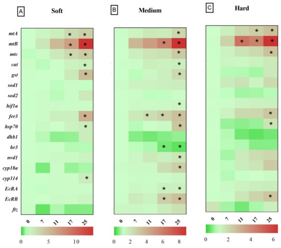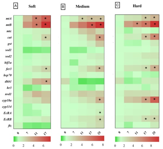 Heat map of gene expression in D. magna after 24 h exposure to copper in different hardness levels (A) 50 (soft); (B) 100 (medium); (C) 200 (hard) mg/L as CaCO3. Asterisks in each row indicate statistically significant differences compared to control group (p < 0.05).