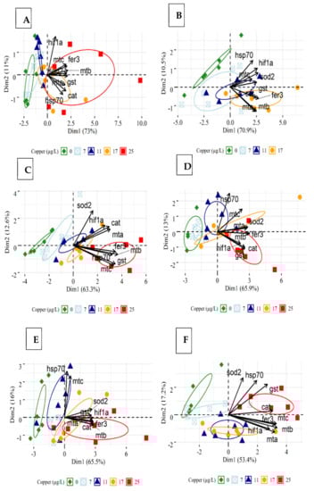 Principal component biplots displaying the relationship between all investigated genes in different hardness levels: (A) Daphnids exposed to Cu in soft water for 24 h. (B) Daphnids exposed to Cu in soft water for 96 h. (C) Daphnids exposed to Cu in medium water for 24 h. (D) Daphnids exposed to Cu in medium water for 96 h. (E) Daphnids exposed to Cu in hard water for 24 h. (F) Daphnids exposed to Cu in hard water for 96 h. (Hardness levels: 50 (soft), 100 (medium), and 200 (hard) mg/L as CaCO3. Ellipses indicate the 95% confidence intervals. A small angle between 2 variables (arrows) (<90) indicates a positive correlation between them. Overall, a positive correlation is observed between variables such as mtA, mtB, fer3, and cat, in different hardness levels.