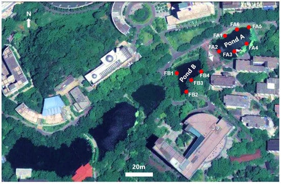 A total of ten sampling sites were investigated in two artificial ponds (Pond A and Pond B; Figure 1) at Southwest University (Beibei, Chongqing, China) in July and November 2019. Sampling sites were separated by 20–30 m in each pond. The surface area was approximately 2000 m2 for Pond A and 1100 m2 for Pond B, and the water depth was approximately 2 m for both ponds. The ponds are fed from rainfall with no stream water inflow. They are connected by a pipe allowing water to flow from the higher pond (Pond A) to the lower pond (Pond B). Because of an interception net with 1 mm mesh netting in the pipe, fish larvae are generally unable to transfer between the two ponds. Using sterile plastic bottles at each site, 1 L surface water samples were collected in triplicate. To check for contamination during the sampling process, 1 L of double-distilled H2O (ddH2O) was included in each pond sampling. For each sampling, a total of 32 water samples, including two negative controls, were stored on ice then immediately brought to the laboratory and filtered using 0.45 µm mixed cellulose acetate and nitrate filters (Whatman, Maidstone, UK). To avoid cross-contamination, all equipment was bleached and rinsed after every filtration for each triplicate sample, and 1 L of ddH2O was filtered to test for contamination during filtration. All filters were subsequently stored at −20 °C until DNA extraction.