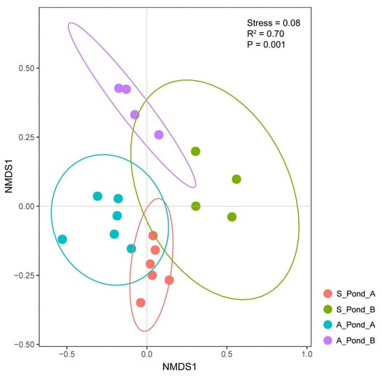 Nonmetric multidimensional scaling (NMDS) ordination of spatial and temporal samples. NMDS analysis using Bray–Curtis matrix based on species read counts for individual sampling sites of two ponds during two sampling periods. Red spots indicate sample collected from Pond A in July 2019 (S_Pond_A), green spots indicate samples collected from Pond B in July 2019 (S_Pond_B), blue spots indicate samples collected from Pond A in November 2019 (A_Pond_A), and purple spots indicate samples collected from Pond B in November 2019 (A_Pond_B). The ellipses indicate a 95% similarity level within each community type in ordinations. NMDS analysis demonstrates a high credibility of ordination results (Stress = 0.08) and significant differences among samples (R2 = 0.70, p = 0.001).