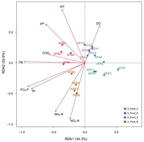Plot of redundancy analysis (RDA) illustrating relationships among water temperature (WT), pH, dissolved oxygen (DO), total nitrogen (TN), nitrate (NO3−N), total phosphorus (TP), ammonium (NH4−N), chemical oxygen demand (COD), and phosphate (PO4−P) and fish communities. Different colors represent sample sites with different spatial and temporal characteristics: purple spots indicate samples collected from Pond A in July 2019 (S_Pond_A), red spots indicate samples collected from Pond B in July 2019 (S_Pond_B), green spots indicate samples collected from Pond A in November 2019 (A_Pond_A) and orange spots indicate samples collected from Pond B in November 2019 (A_Pond_B).