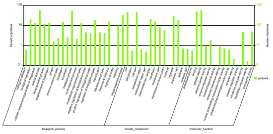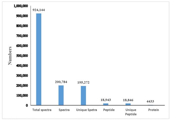 A total of 924,144 spectra were detected, including 195,272 unique spectra. A total of 4433 proteins were identified and distributed in different ranges of peptide sequence coverage (Figure 1; Table S1). Among them, 1857 proteins were annotated into three major ontologies—biological processes, molecular functions, and cellular components—by Gene Ontology (GO) enrichment analyses (Table S2). Biological processes had 0.74% of proteins involved in immune system process terms (Figure 2). In addition, 2125 proteins were mapped and classified into 24 different cluster of orthologous group (COG) categories. In the COG category, 9 proteins were annotated to the V category “defense mechanisms” (Figure 3; Table S3). Of the identified proteins, 3498 were annotated with 301 Kyoto Encyclopedia of Genes and Genomes (KEGG) pathways, of which 2.89% were involved in the phagosome pathway (Table S4)