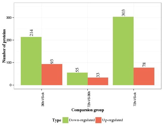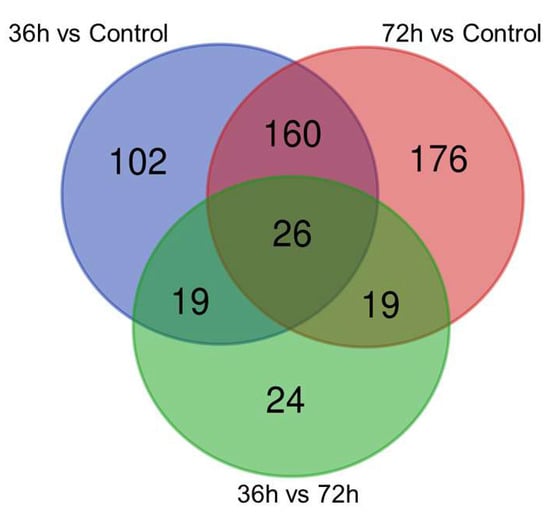 Using a 1.2-fold increase or decrease in protein expression as a benchmark for physiologically significant changes, we found that 214 (93) and 303 (78) proteins were significantly downregulated (upregulated) at 36 h and 72 h, respectively, between the experimental and control groups. Moreover, in the experimental group, 55 (33) proteins were significantly downregulated (upregulated) at 36 h in comparison to 72 h (Figure 4).
