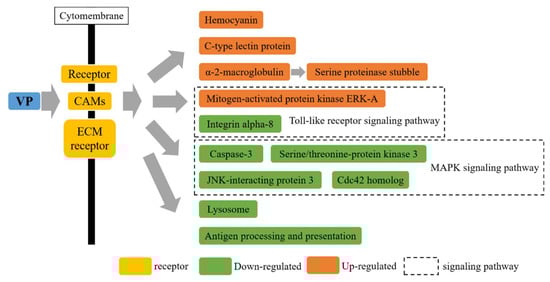 The Toll-like receptor signaling pathways and phagosomes are key in protecting crustaceans against pathogenic infections [38,39,40]. Herein, the phagosome and Toll-like receptor signaling pathways were affected in response to V. parahaemolyticus, with 24 DEPs identified in the two pathways. The complement and coagulation cascades pathways have been reported to play an important role in the immune response of P. trituberculatus to Hematodinium infection [38], Larimichthys crocea to Cryptocaryon irritans [41], and E. sinensis to S. eriocheiris [42]. In this study, the complement and coagulation cascades pathways were remarkably affected, with five relevant proteins being differentially expressed in the hemocytes of P. trituberculatus, including A2M and serine proteinase stubble. CAMs play an important role in mediating the migration of immune cells and maintaining tissue integrity [43,44,45]. The CAM pathway was also influenced (18 DEPs identified) in response to the V. parahaemolyticus challenge. The protein levels of some important CAMs (integrin α-8, laminin subunit β-1 and γ-1, and fasciclin-2) were significantly induced. In addition, the ECM–receptor interactions, focal adhesion, lysosomes, tight junctions, and MAPK signaling pathway were considerably affected(19, 21, 10, 10, and 10 DEPs identified, respectively) in response to V. parahaemolyticus infection. The metabolism of xenobiotics by cytochrome P450, peroxisomes, antigen processing and presentation, T and B cell receptor signaling pathways, and the TNF signaling pathway were all found to be significantly affected, too. To summarize, our results indicate that these pathways play an important role in the immune response of P. trituberculatus to V. parahaemolyticus infection