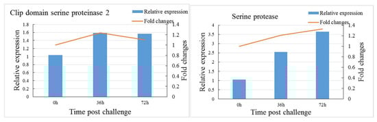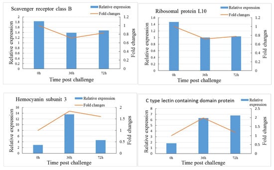 To confirm our iTRAQ results, the mRNA transcript levels of six immune-related DEPs, including two significantly downregulated (ribosomal protein L10, scavenger receptor class B) and four significantly upregulated (hemocyanin subunit 3, C-type lectin containing a domain protein, clip domain serine proteinase 2, serine protease) proteins at 36 h after the V. parahaemolyticus challenge, were validated by qRT-PCR (Figure 7). The mRNA transcript levels of most genes showed a consistent alteration trend with the corresponding proteins, but a disparity was noted between the mRNA transcript levels and protein abundance of C-type lectin containing a domain protein at 72 h after the V. parahaemolyticus challenge.