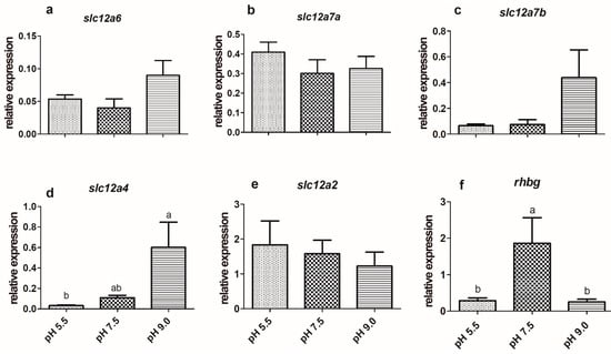 Silver catfish exposed to a pH of 9.0 showed a higher expression of slc12a4 in the kidney, compared to those at a pH of 5.5 (Figure 4d), but in the gills, there was no significant differences between fish from different pHs (Figure 3d). The highest expression of branchial slc12a2 was observed at a pH of 5.5 (Figure 3e), and there were no changes in the renal expression of this gene (Figure 4e). The expression of branchial rhbg was higher at acidic pH (5.5) than at neutral pH (Figure 3f); whereas in the kidney, its expression was lower at a pH of 5.5 and 9.0 than at a pH of 7.5 (Figure 4f).