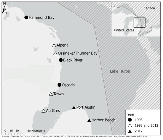 Locations of study sites along the Michigan shoreline of the United States in western Lake Huron sampled in 1993 [35] and 2012.