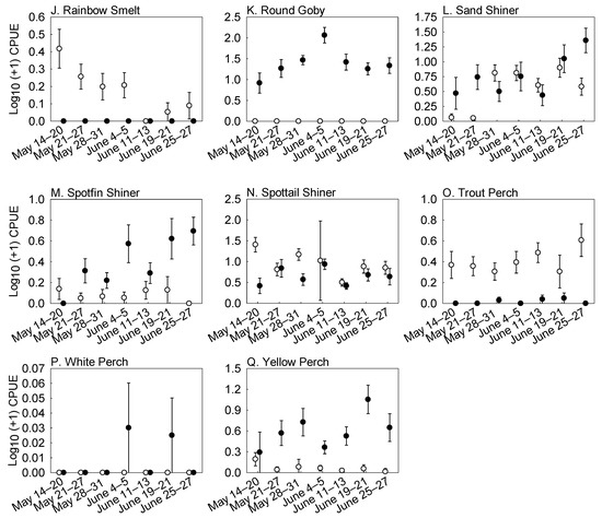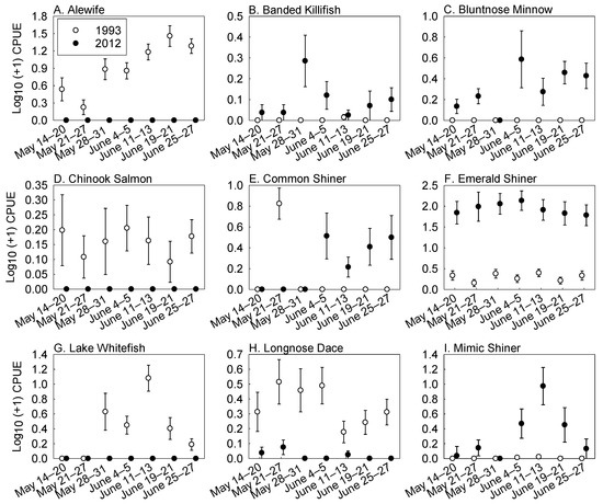 (A–Q) Mean (±SE) log10 (+1) catch per unit effort (CPUE; #/seine haul) of the dominant species of nearshore beach fish assemblages during the spring 1993 (open circles) and spring 2012 (closed circles). Fish were collected at sites along the Michigan shoreline of western Lake Huron (see Figure 1 for sampling locations).