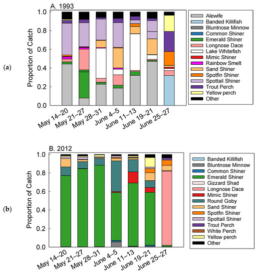 The nearshore beach fish assemblage in 1993 was dominated by cyprinid species (42% of catch), alewife (31% of catch), lake whitefish (Coregonus clupeaformis) (11% of catch), and salmonid species (3% of catch) [35] (Table 2, Figure 3a). In spring 2012, the fish assemblages were dominated by cyprinid species (83% of catch), round goby (12% of catch), and percid species (3% of catch) (Table 2, Figure 3b). Chinook salmon, lake whitefish, and rainbow smelt were absent in 2012. Bluntnose minnow (Pimephales notatus), round goby, and white perch (Morone americana) were abundant in 2012 but absent in 1993 (Table 2, Figure 3a,b). Proportions of catch alewife, rainbow smelt, spottail shiner, trout perch, centrarchidae, and cyprinidae were higher in 1993 than in 2012. Proportion of banded killifish (Fundulus diaphanous), bluntnose minnow, emerald shiner, mimic shiner, round goby, yellow perch, catostomidae, and ictaluridae were higher in 2012 than 1993 (Table 2, Figure 3a,b).
