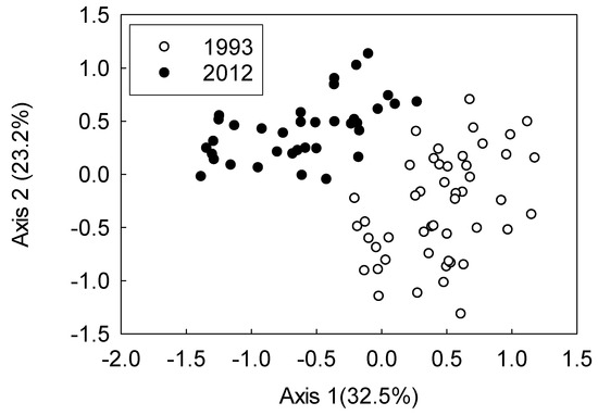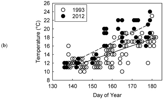 The influence of water temperature on the species composition was examined in both regional and local contexts and compared to the thermal tolerance data for specific species. Regionally, we downloaded water temperature (°C) data from the NOAA buoy #45008 in South Lake Huron at 43 NM East of Oscoda, MI (44.283 N 82.416 W; https://www.ndbc.noaa.gov/station_history.php?station=45008, accessed on 11 November 2019) for the months of May and June from 1993 through 2012. This buoy was selected because it was closest and in the center of the field sites sampled. We examined the annual monthly means across the time series with linear regression to test the null hypothesis of no increase in mean monthly temperature through the time period (PROC REG, SAS, version 9.4). Water temperature (°C) was also recorded locally during each sampling event in 1993 and 2012. Increases in water temperature during the sampling season within a year were examined with linear regression (PROC REG, SAS, version 9.4). Temporal differences among years were tested by comparing slopes of the daily water temperature data using year as a categorical covariate (PROC MIXED, SAS, version 9.4). We also compiled thermal guild, preferred temperatures, and/or final temperature preferendum of the dominant fish species from the literature [37,38] to better understand changes in fish assemblages.
