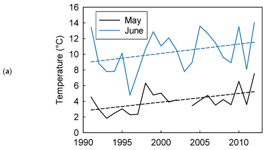 Regionally, mean monthly water temperature from the offshore buoy was highly variable in both May and June (Figure 5a). May temperatures ranged between 1.83 °C (1993) and 7.54 °C (2012), and May temperatures increased significantly over the time period at a rate of 0.14 °C/year (r2 = 0.31, p = 0.01). Similarly, June mean monthly temperatures ranged between 4.78 °C (1996) and 14.03 °C (2012) and increased at a rate of 0.19 °C/year (r2 = 0.21, p = 0.04). Within a sampling period in a given year, water temperatures increased over the sampling period (1993: mean = 14.4 °C, rate = 0.17 °C/day, r2 = 0.60, p < 0.0001; 2012: mean = 16.6 °C, rate = 0.23 °C/day r2 = 0.68; p < 0.001). The increase in temperature (i.e., slope) through the sampling season was higher in 2012 (F1,211 = 10.40, p = 0.002, Figure 5b).