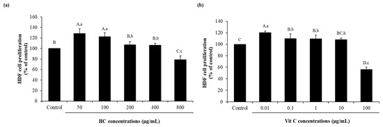 Effect of HC from salmon skin (a) and vitamin C (Vit C) (b) at different levels on the proliferation of human dermal fibroblast (HDF) cells. Bars represent standard deviation (n = 3). Different uppercase letters on bars indicate significant differences between different samples tested and control (p < 0.05). Different lowercase letters on bars indicate significant differences among samples tested with HC or Vit C at different concentrations (p < 0.05).